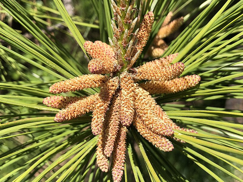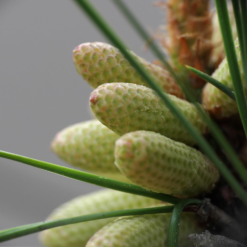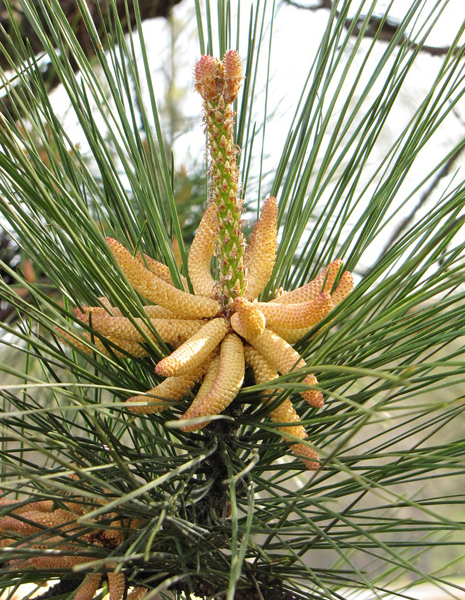 Male flowers: catkins in clusters at the tip of the preceding year’s growth,